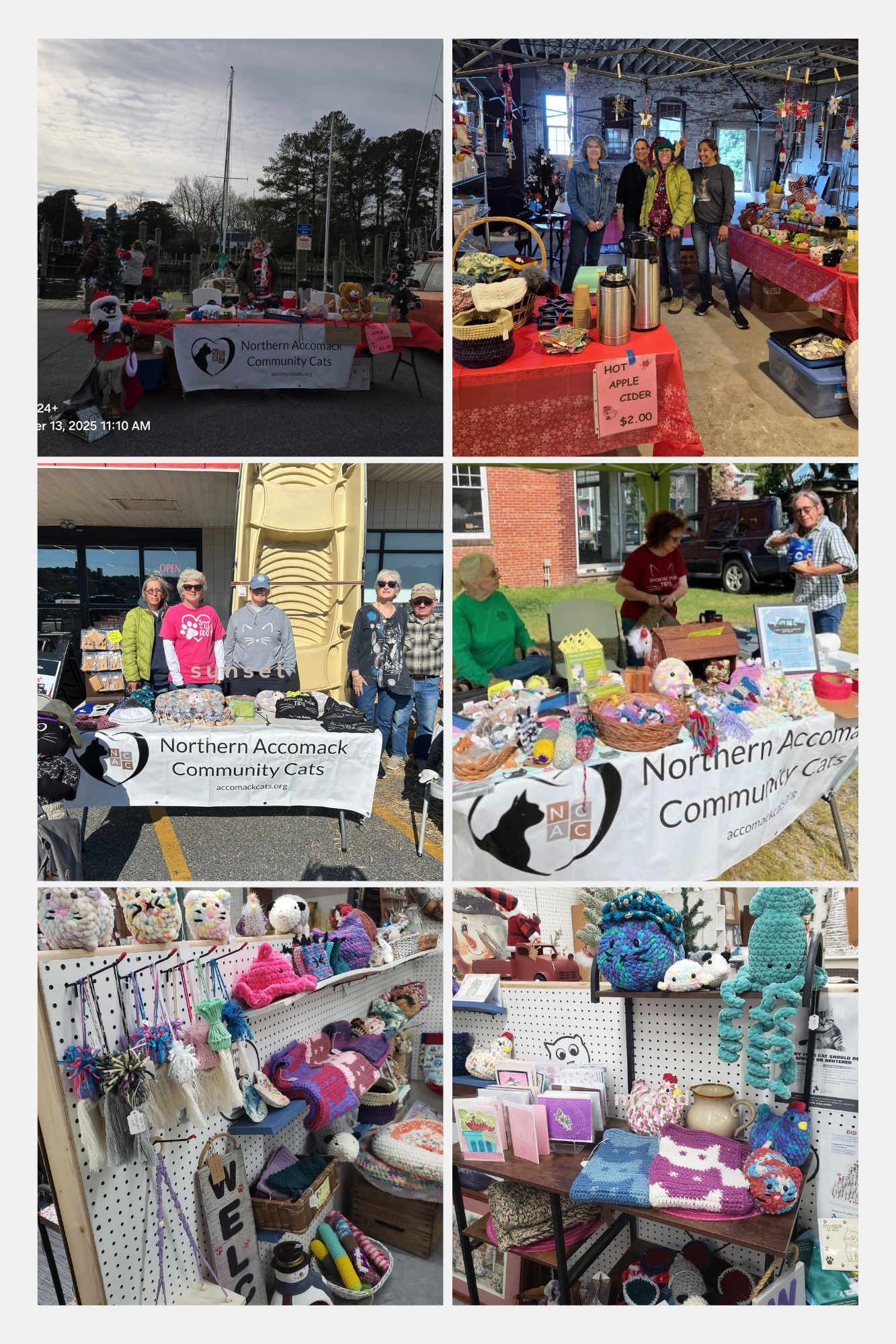 In 2025, we also attended the Onancock farmers’ and holiday markets as well as several bake sales. And check out the great crafts that are for sale in the Blue Crow Antique Mall in Painter VA. Our volunteers donate their hand-made items for all of these events. Not only is this a fund raising opportunity for NACC, it also gives us a chance to educate the public about community cats and TNR.